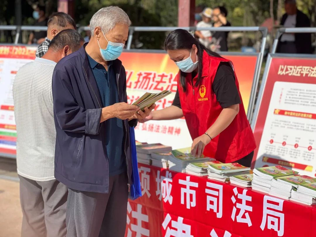 9月15日,项城市委政法委、市法学会在人民公园参加“2022年项城市社会科学普及周”宣传活动。
