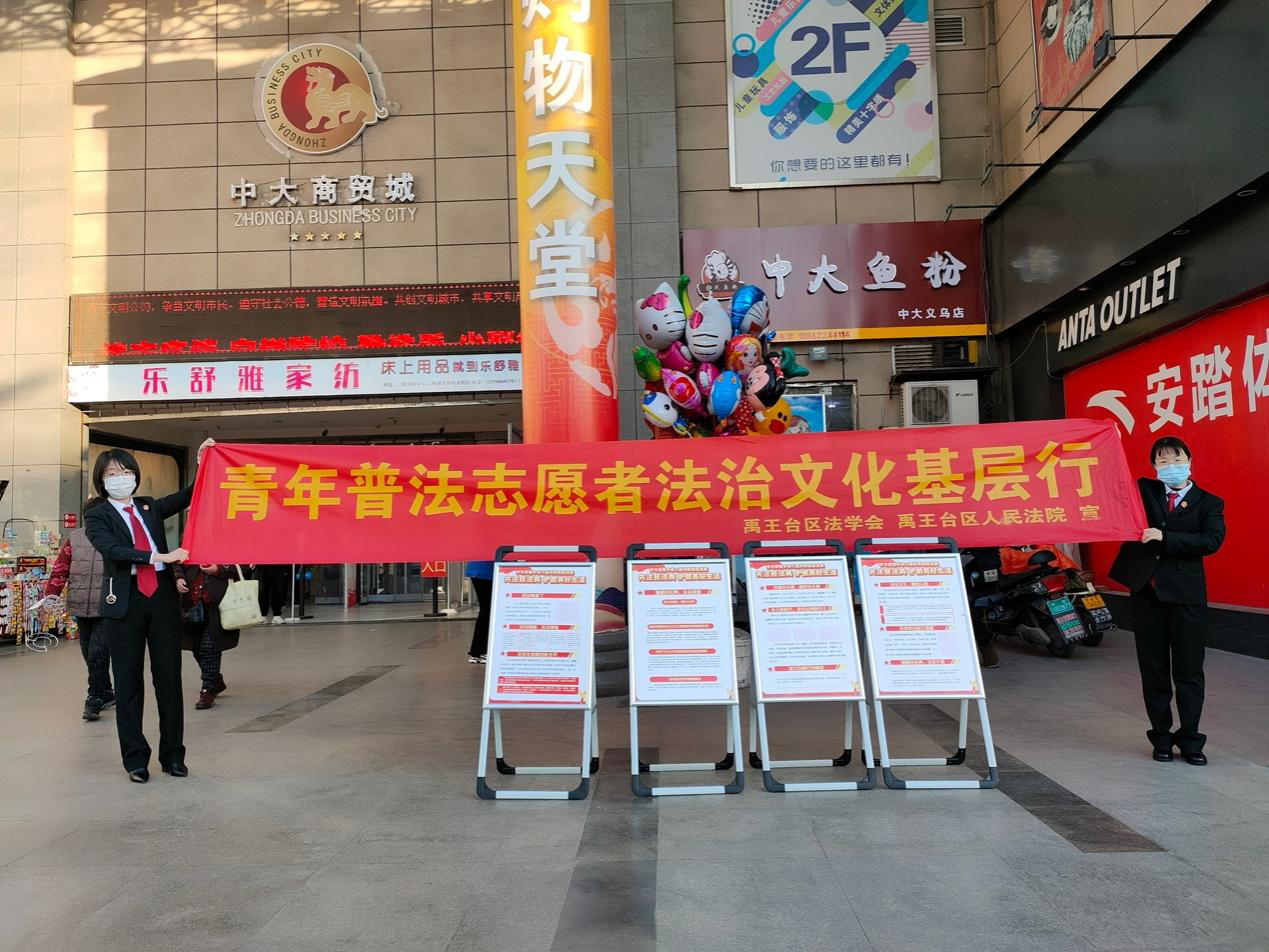 为更好营造尊法、学法、守法的浓厚氛围,让《民法典》走到群众身边、走进群众心里,在《民法典》施行一周年之际,禹王台区法学会人民法院工作站的志愿者们来到中大商贸城开展普法宣传活动。