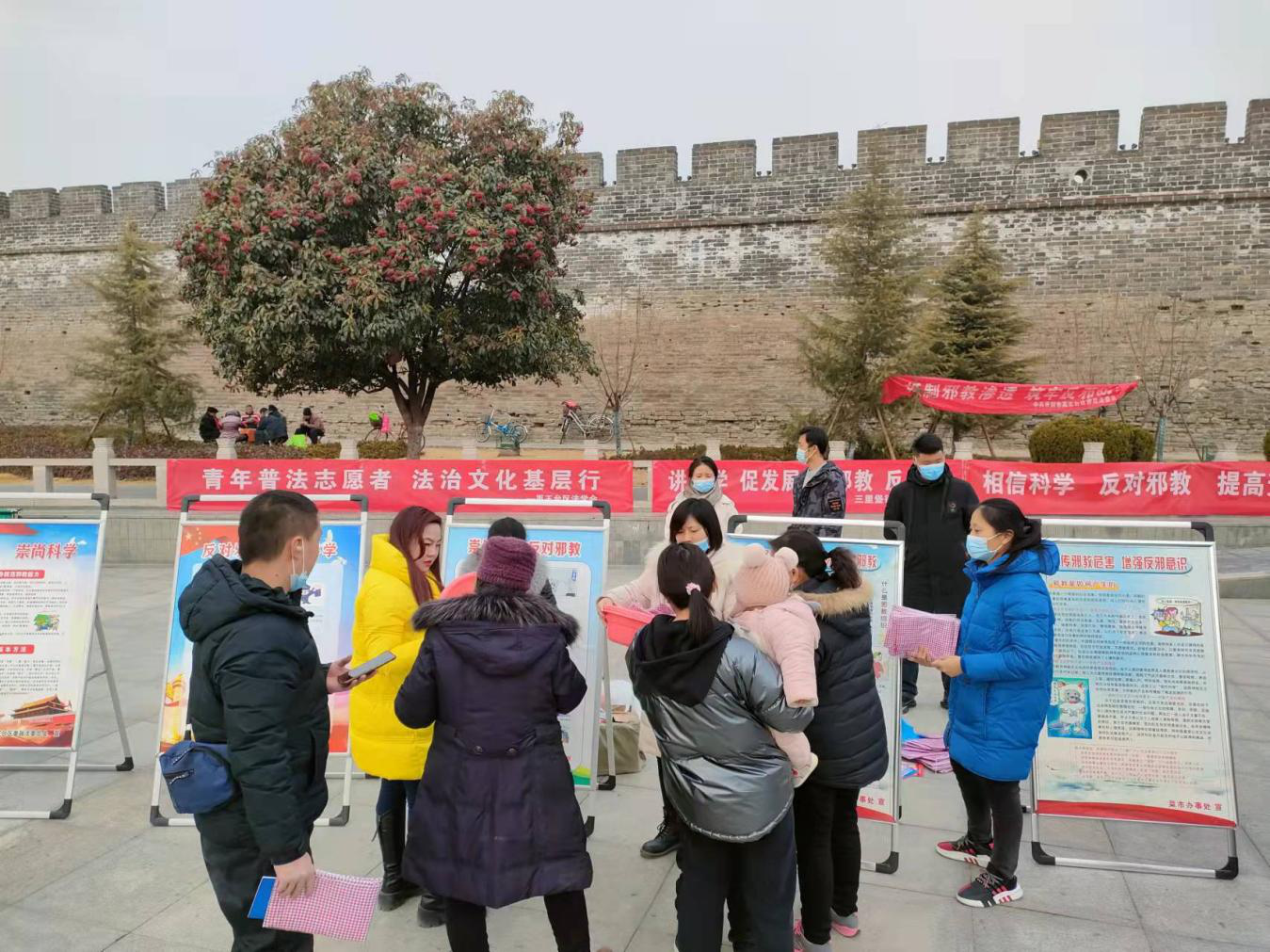 为了进一步推动反邪教工作,提高群众反邪教的知晓率参与度,12月31日下午,禹王台法学会常务副会长李娅带领工作人员,联合三里堡街道工作站、菜市街道工作站在大南门法治文化广场开展青年普法志愿者 法治文化基层行活动。