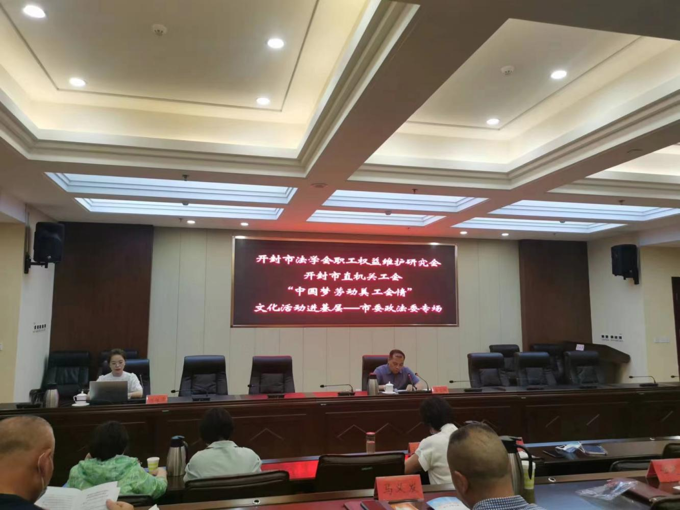 为做好职工权益维护工作,进一步激发和调动广大干部职工喜迎二十大、建功新时代的工作激情,根据市总工会工作要求,结合开封市法学会职工权益维护研究会工作计划,2022年8月16日,市法学会职工权益维护研究会联合市直机关工会在市委政法委举办了“中国梦劳动美工会情”文化进基层市委政法委专场活动。会议由市委政法委副书记翟宝群同志主持,市委政法委机关党委副书记王亚平同志参加会议。