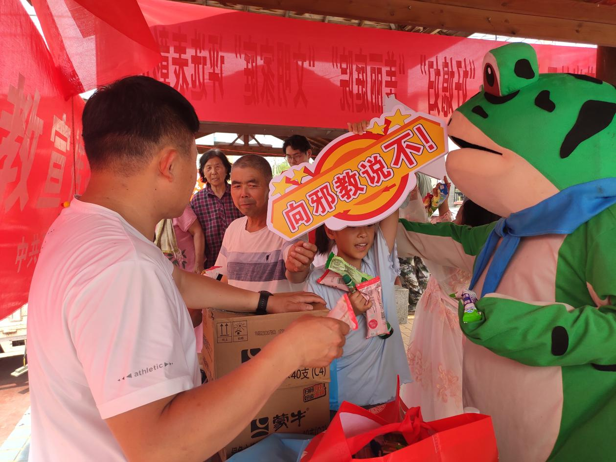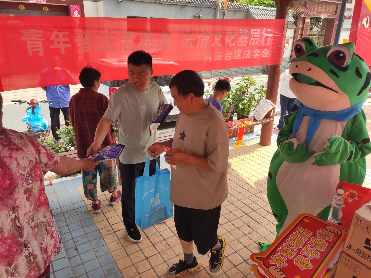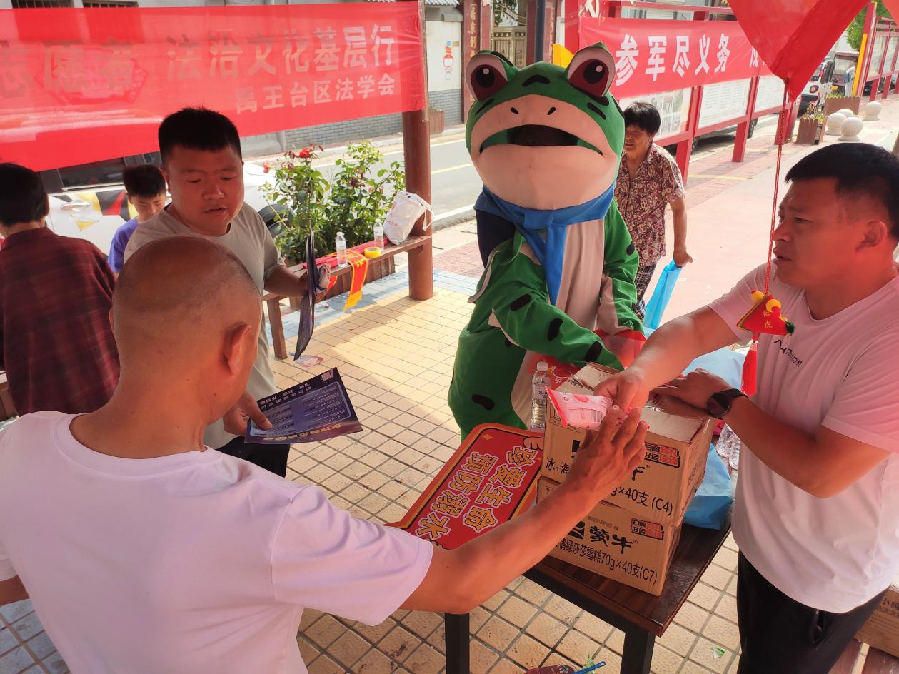 禹王台区法学会南郊乡工作站创新普法形式,延伸普法触角,通过“群众喜欢、年轻人爱看”的方式“靶向施策”,加强“点对点、面对面”的宣传服务。以年轻人及儿童在短视频中喜闻乐见的“网红青蛙”形象,为群众送上一道丰盛的“法治大餐”。6月21日,南郊乡工作站普法小蛙正式上线,在芦花岗社区向群众发放了平安建设宣传彩页,防溺水、国家安全、扫黑除恶、反邪教、禁毒等宣传册,以及雪糕、手提袋和扇子等宣传品。