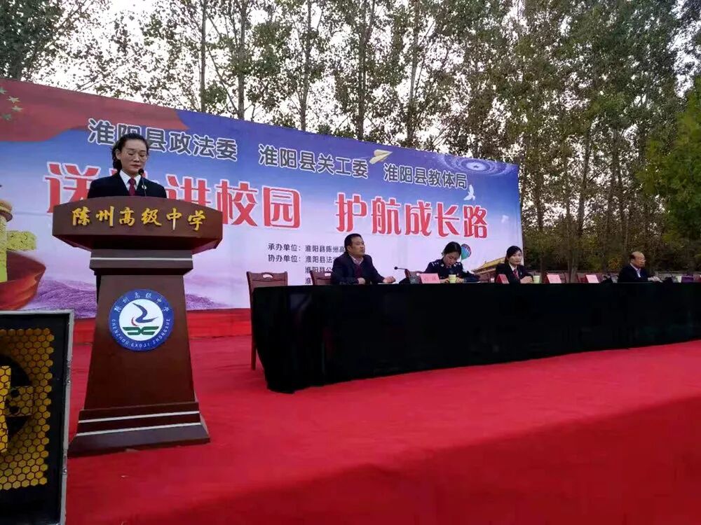 11月5日下午,淮阳县委政法委、县关工委、县教体局、县法学会组织法治宣讲团走进陈州高中,为高二年级学生作了一场以“送法进校园、护航成长路”为主题的法制报告。活动现场,法治宣讲团成员讲解了法律常识、未成年人犯罪案例、预防校园欺凌常识和技能,并作了感恩励志教育等,赢得师生阵阵掌声。