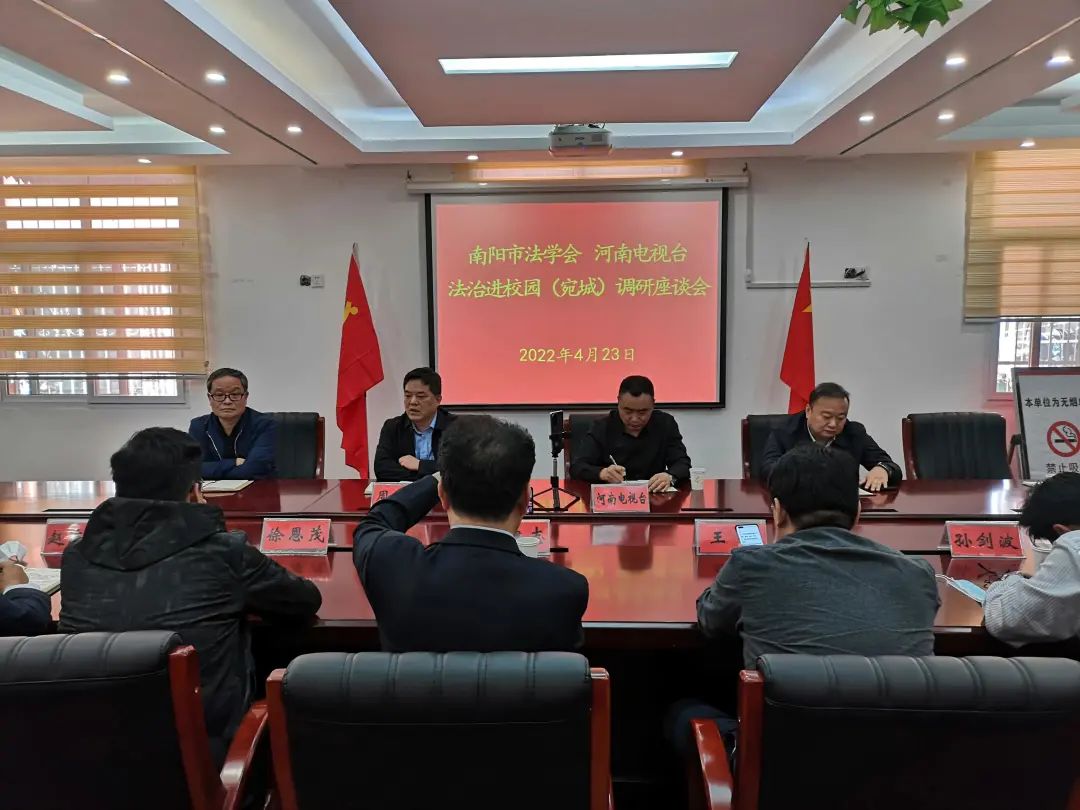 4月23日上午,南阳市法学会、河南广播电视台法治频道联合举办法治进校园调研座谈会,市法学会副会长周付祥、副秘书长候玉军,河南广播电视台李庆军主任,宛城区委政法委、宛城区教体局分管领导以及市三中、市实验学校、市第二完全学校、市四中、市第九小学的校长参加座谈。会议由宛城区委政法委副书记段文洲主持。