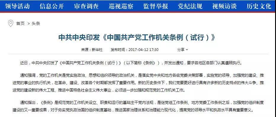 要回答这个问题,还得先从2017年3月1日施行的《中国共产党工作机关条例(试行)》里找答案。