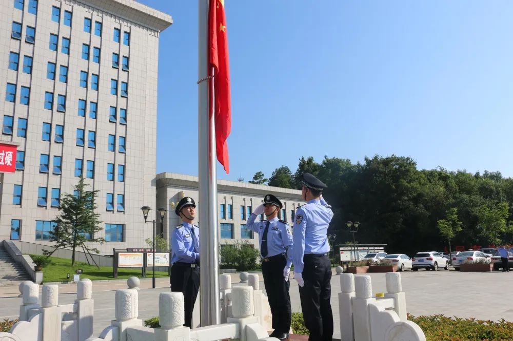 早上八点,迎着朝阳,三名旗手迈着整齐划一的步伐,护卫着鲜艳的五星红旗缓缓入场,伴随着激昂的《义勇军进行曲》,五星红旗徐徐展开,所有干警肃然而立,高唱国歌,面向国旗行注目礼,深切表达忠于国家、忠于人民的情感。
